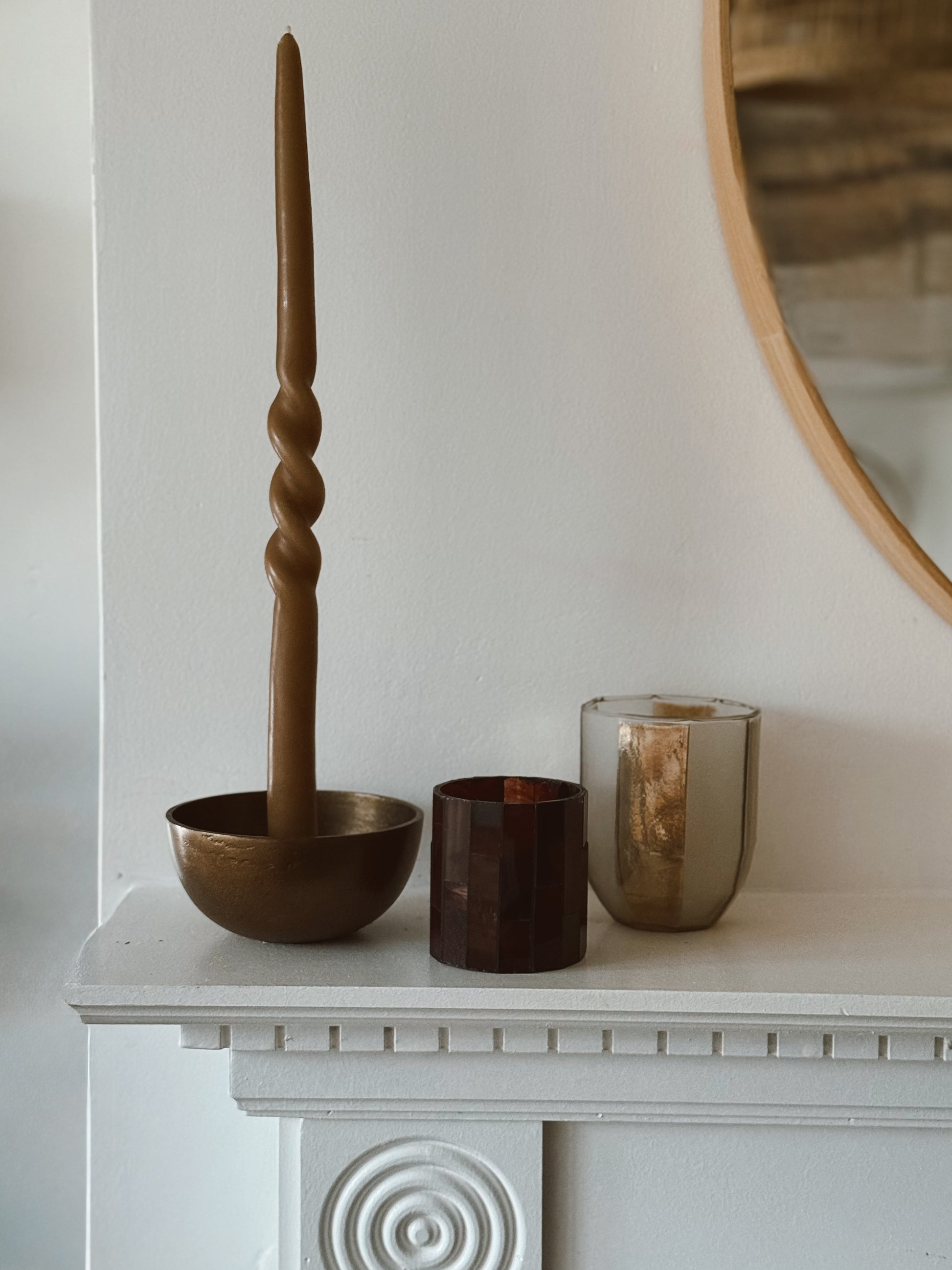 The Evening Glow Set brings together warm brass tones, textured glass and sculptural candlelight to create depth and atmosphere within your space. Designed to be styled together, this curated bundle transforms consoles, shelves or dining tables into softly lit moments.