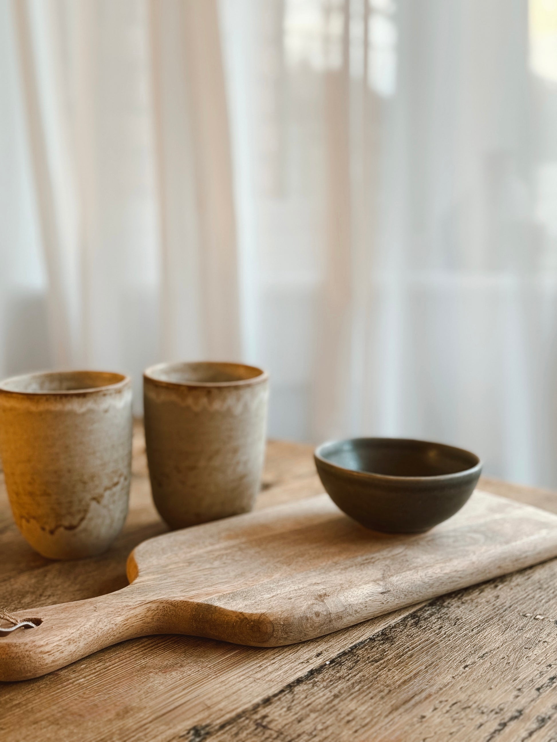 The Slow Kitchen Edit pairs textured ceramic mugs with a natural wooden board and sculptural bowl, creating a grounded, tactile moment at your table. Designed for coffee, shared breakfasts or unhurried rituals, this curated bundle balances form and function effortlessly.